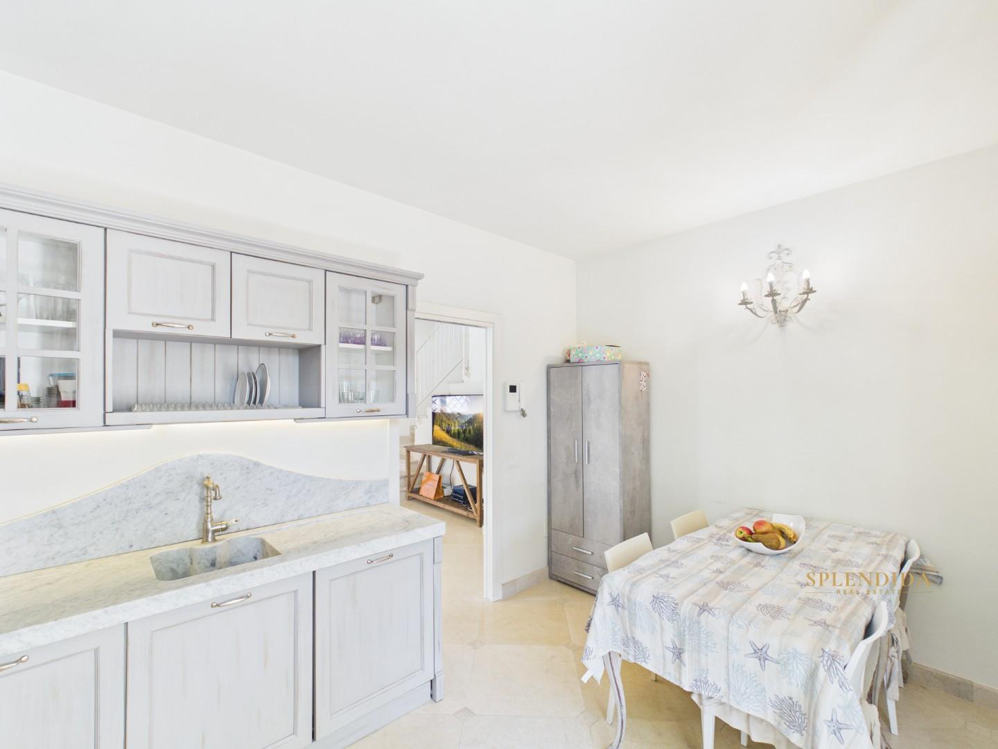 La proprietà è disposta su due livelli più il piano seminterrato ed è così composta: a piano terra ampio soggiorno con zona pranzo, cucina abitabile con porta finestra e bagno; al primo piano una camera matrimoniale con bagno in suite, una cameretta singola, una doppia ed il bagno.